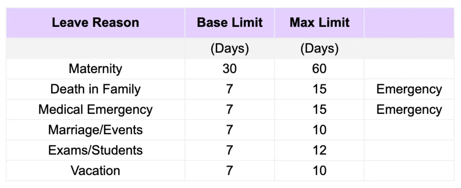 Example: A teacher has 14 credits available to her/him while taking a 10-day long leave of examination. She requires 24 credits to apply for long leave, of which 16 are consumed within the base limit for examination, which is 7 days. The teacher will be exempted for two leave credits (16 base limit-14 available) and a penalty of eight credits will be imposed. However, because the days are still within the Max limit, the teacher is retained and can return to BrightChamps as a faculty member.